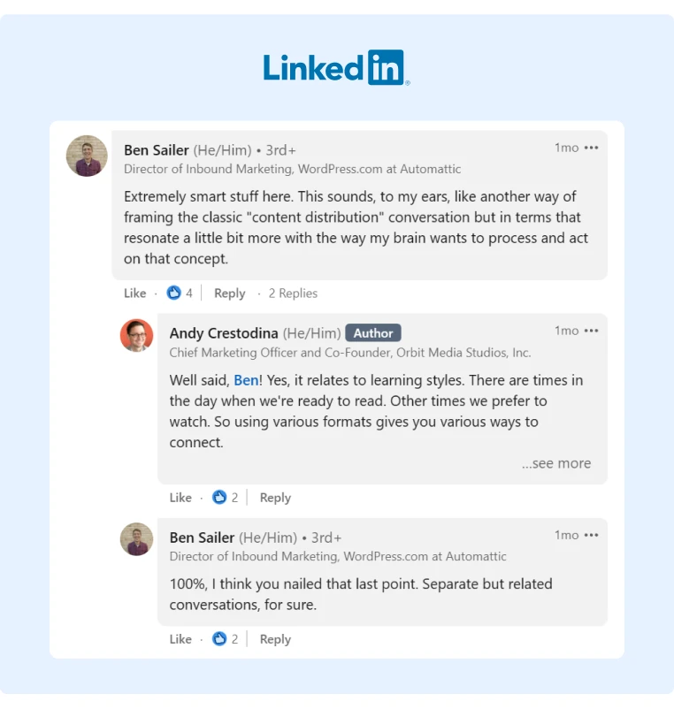 Andy Crestodina is an excellent example of an influencer that consistently engages with his audience authentically. Here's just one example of how he takes time to write thoughtful responses to his followers' comments:
